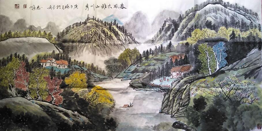 先生的画笔并不作局限师承某派,有将传统笔墨技法妥善之变化,并注重师法造化,并融入艺术质素更为丰富的诗的情愫与画的意境,能自然的转换和流动色彩,从而使画面呈现了一种活生生的,熟悉的美。让人倍感亲切。“中国山水画具有一定的抽象性,而其表现形态主要是笔悄墨趣;中国画又以意象造型为主,意象造型可使画家能比较自由地造型和处理构图。中国山水画的抽象性、意象性使中国画的情趣美具有很大的挖掘潜力和展示空间,山水画尤其这样。”他的作品化笔墨为情趣,化景物为情趣,也充分把自然与情感舒展活了!