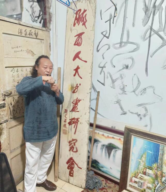 从外貌上看,先生个头不高,面色红润,淡眉,桃花眼,鼻翼轮廓分明,谢顶,比较明显的特征还有头发,发梢卷而垂肩,上身着一件深灰色的便服布褂,布褂上印有自书《兰亭序》的行草墨字,性嗜烟酒,一看就是性情中人。