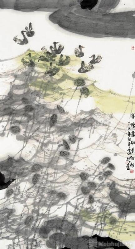 我注意到他的构图与传统的留白有所不同,他往往用整体的“满”,突出“鸟”的灵动,营造出个体与群像之间独特的对比感;甚至落款也在居中位置,这方面又似乎有北宋山水画的意境。长安画派中工于花鸟画的大家,首推康师尧先生,我从线庐的作品中看到他对康先生用笔的承继,但无论是构图还是作品的表现,都呈现出郭线庐自己的时代面貌。他的花鸟画个性鲜明,是当代中国画变革的新成果。