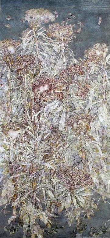 创作中,天军教授做了不少突破——造型上,参考了宋人小品画、郎世宁、陈之佛以及近现代名家作品后,决定跳出写实,追求唯美的意象表达;色彩上借鉴西方名画、国内优秀作品和日本岩彩画,跨越时空融合昼夜景象,削弱绿叶的绿色,突出白叶红花,加重背景,让画面更淡雅;视角上,摒弃常见的俯视、平视,采用仰视角度,把鸡冠花画成“树”一样,以蚂蚁的视角呈现,让构图更有张力,画面在方形分割中含椭圆形主体,左右有无限延展的感觉;花型组织上,串联了近10年在泰安、敦煌、家乡等地写生的鸡冠花,涵盖不同生长阶段、形态的植株,像一个“小社会”,体现丰富情态。技法上,传统工笔和水墨已经满足不了天军教授,多次探访敦煌莫高窟、云冈石窟等四大名窟和永乐宫,吸收传统矿物色应用技巧,结合当代岩彩画技法,运用新材料、新媒介和新肌理。《金髻太平》,十年磨一剑,前期画了数以百计的速写草图、大量的电子素材积累,相机用坏两三台,最终在第十二届美展中脱颖而出,一举成功!