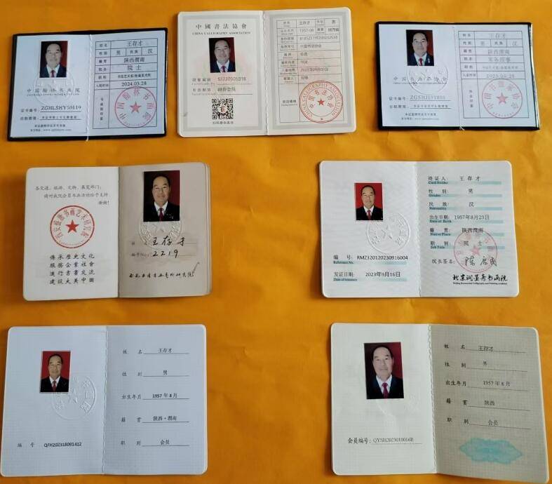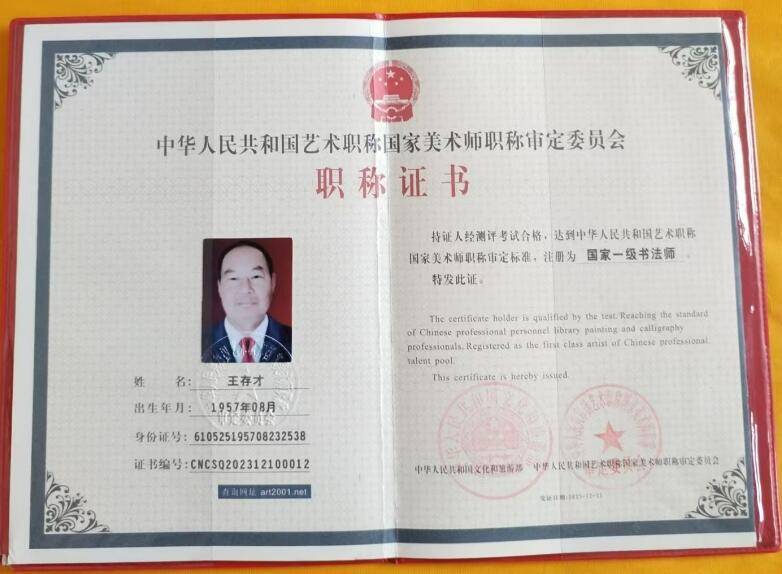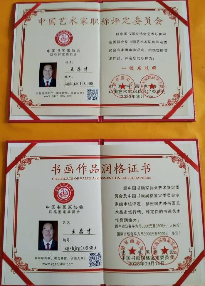 现为:中华人民共和国艺术职称国家美术师职称审定委员会注册:国家 一级书法师。中国书法协会会员<香港>。中国翰林书画院院士 。中国书画家协会常务理事。艺术家职称评定委员会一级书法师。中国书画润格鉴定委员会:国内市场每平方尺6600元至9500元<人民币>、国际市场每方尺3000元至6000元<美元>。北京润墨斋书画院院士。北京秦韵源书画院会员。北京曲风书画院会员。西安盛唐书画艺术研究院理事。