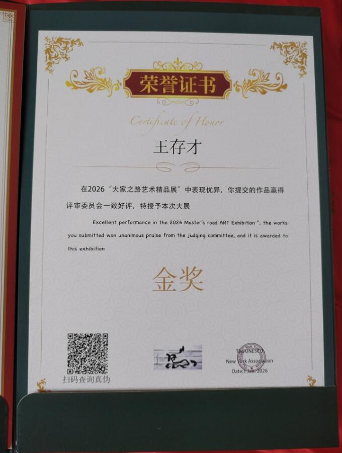 【中国名人堂名人网】摘录:当三月的春风轻拂枝头,千年三秦大地之上,桃花灼灼其华,粉白相间的花影自在随风,悠然自得,当一份精美的“金奖”荣誉证书从中国艺术研究院快递到王存才老师手中时,这是一份对书法艺术崇高的敬意,也是一份对高维能量书法作品的顶尖认同,2025年的“大家之路艺术精品展”,上千万份优秀的书法书画艺术作品争相斗艳,但高维能量书法却是独树一枝,也是唯一的,无可比拟模仿的,它只属于中国.陕西.渭南.澄城县,民间祈福师,人体潜能疗养师,国学文化传承师,笔杆子风水师,国家一级书法师王存才书法老师。