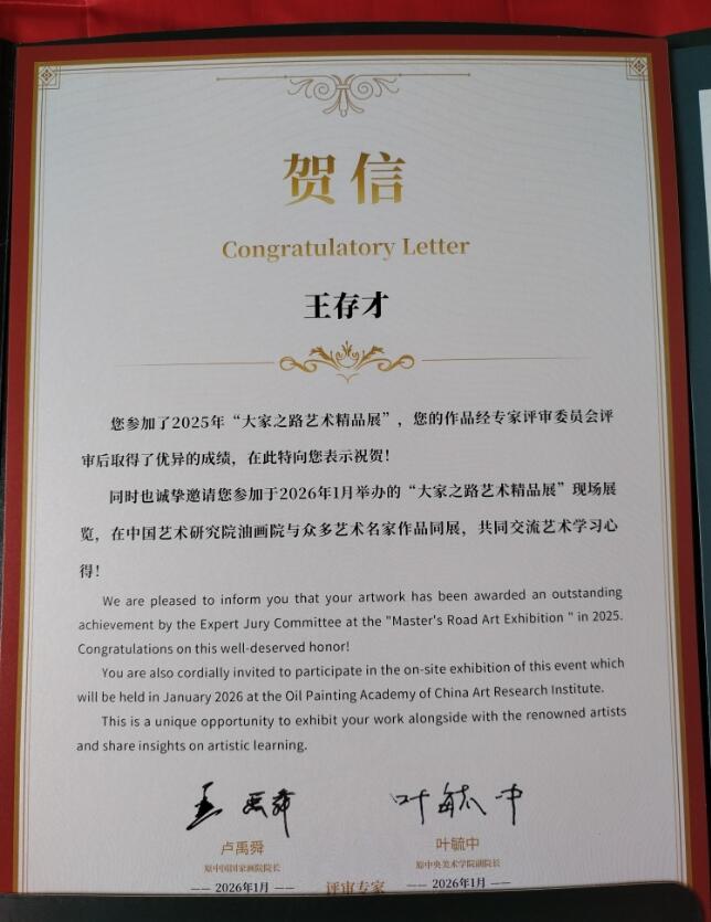 当这份来之不易的荣誉被更多的人们关注时,它的价值在不经意中飞速变化着,飞出国门,飞向北美洲,已经在美國國際藝術周委會中有了一席之地:你看这份荣誉证书的含金量:鑒于您取得的藝術成就,并爲促進中美文化藝術交流做出的貢獻,已被評選入編美國大型國際藝術交流刊物--《美國國際藝術周刊》,同時授予中美文化藝術貢獻特使稱號。特發此證,以資鼓勵!这就是实力,也是高维能量磁场赋予的信念。当这份属于王存才书法老师的荣誉呈现在公众眼前时,你是否会想起曾经的国际艺术周刊推荐艺术家征集活动有多重要。